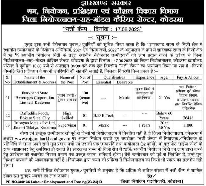 झारखण्ड सरकार के श्रम, नियोजन, प्रशिक्षण एवं कौशल विकाश विभाग के द्वारा राज्य में पढ़े लिखे बेरोजगार युवाओ/युवतियों को रोजगार देने के लिए Jharkhand Rojgar Bharti Camp / Jharkhand Rojgar Mela का आयोजन करवाती हैं। श्रम, नियोजन, प्रशिक्षण एवं कौशल विकाश विभाग ने कोडरमा रोज़गार भर्ती मेला आयोजन हेतु आधिकारीक सूचना जारी कर दी हैं। ज़िला नियोजनालय-सह-मॉडल कैरियर सेंटर, कोडरमा परिसर में 17 जून 2023 को 10:00 बजे से 04 :00 बजे तक एक दिवसीय रोजगार भर्ती कैंप का आयोजन किया जा रहा है।